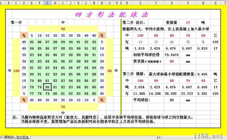 設(shè)定自動(dòng)計(jì)算表后,只需輸入研磨體規(guī)格、裝載量和要求的平均球徑三種數(shù)據(jù),更可得出相應(yīng)的級(jí)配結(jié)果,非常方便實(shí)用。