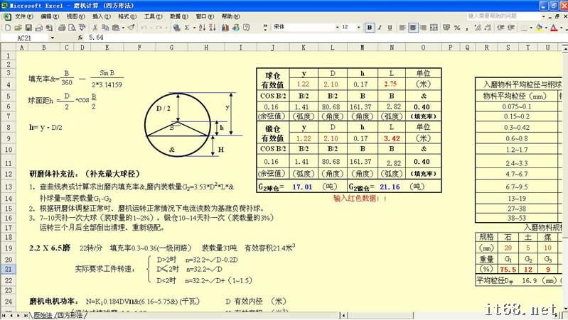 如下圖:有效半徑D和有效倉(cāng)長(zhǎng)L是已知數(shù),試用輸入球面凈空高y的數(shù)據(jù)可得出你要求的填充率&,同時(shí)也得出了研磨體的填充量。(凈空高與填充率基本是同一個(gè)概念,而凈空高在實(shí)際生產(chǎn)中更實(shí)用,說(shuō)不定哪天就要打開(kāi)磨門(mén)量一下,補(bǔ)上一些鋼球。H缓蟾鶕(jù)入磨材料的粒徑求出平均球徑,根據(jù)平均球徑的要求以“兩頭小中間大的原則”可得出各種球體的級(jí)配。而這些求解方法都可以利用Excel的自動(dòng)計(jì)算功能設(shè)定后方便地進(jìn)行。