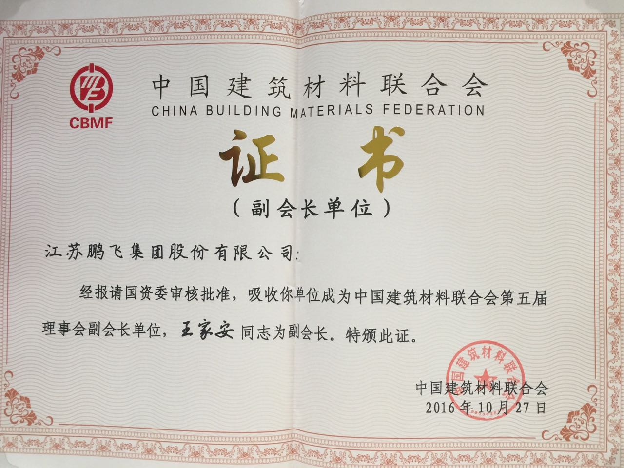 經(jīng)報(bào)請(qǐng)國(guó)資委審核批準(zhǔn),江蘇鵬飛集團(tuán)股份有限公司吸收成為中國(guó)建筑材料聯(lián)合會(huì)第五屆理事會(huì)副會(huì)長(zhǎng)單位。王家安同志為副會(huì)長(zhǎng)。