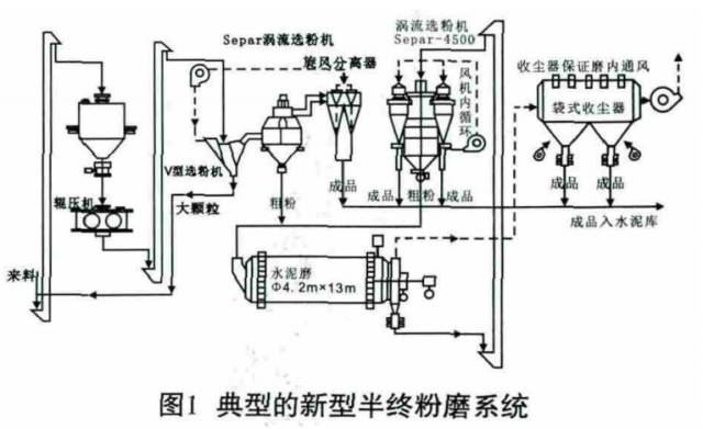 (4)隨著水泥粉磨工藝研究的不斷進(jìn)步,對(duì)傳統(tǒng)聯(lián)合粉磨系統(tǒng)的不斷優(yōu)化,“大輥壓機(jī)配小球磨機(jī)”的半終粉磨系統(tǒng)脫穎而出。與傳統(tǒng)聯(lián)合粉磨工藝系統(tǒng)相比,輥壓機(jī)半終粉磨工藝采用一臺(tái)物料處理能力較大的輥壓機(jī)和一臺(tái)喂料、分選能力大的下進(jìn)風(fēng)雙分離高效選粉機(jī),將V選后的細(xì)粉再次進(jìn)行分選,合格細(xì)粉從入磨前的物料中被分選出來(lái)并直接送入成品庫(kù),中粗粉進(jìn)入球磨機(jī)進(jìn)行粉磨,大幅度提高了成品產(chǎn)量,改善了球磨機(jī)的工況,減少了過(guò)粉磨現(xiàn)象的發(fā)生。同時(shí)V型選粉機(jī)與雙分離高效選粉機(jī)共用一臺(tái)系統(tǒng)風(fēng)機(jī),取消了聯(lián)合粉磨系統(tǒng)中一臺(tái)循環(huán)風(fēng)機(jī)與旋風(fēng)收塵器及部分管道和輸送設(shè)備,進(jìn)而提高了球磨機(jī)的綜合臺(tái)時(shí)產(chǎn)量,降低了粉磨電耗,減少了設(shè)備數(shù)量和維修成本。典型的新型半終粉磨系統(tǒng)如圖1所示。